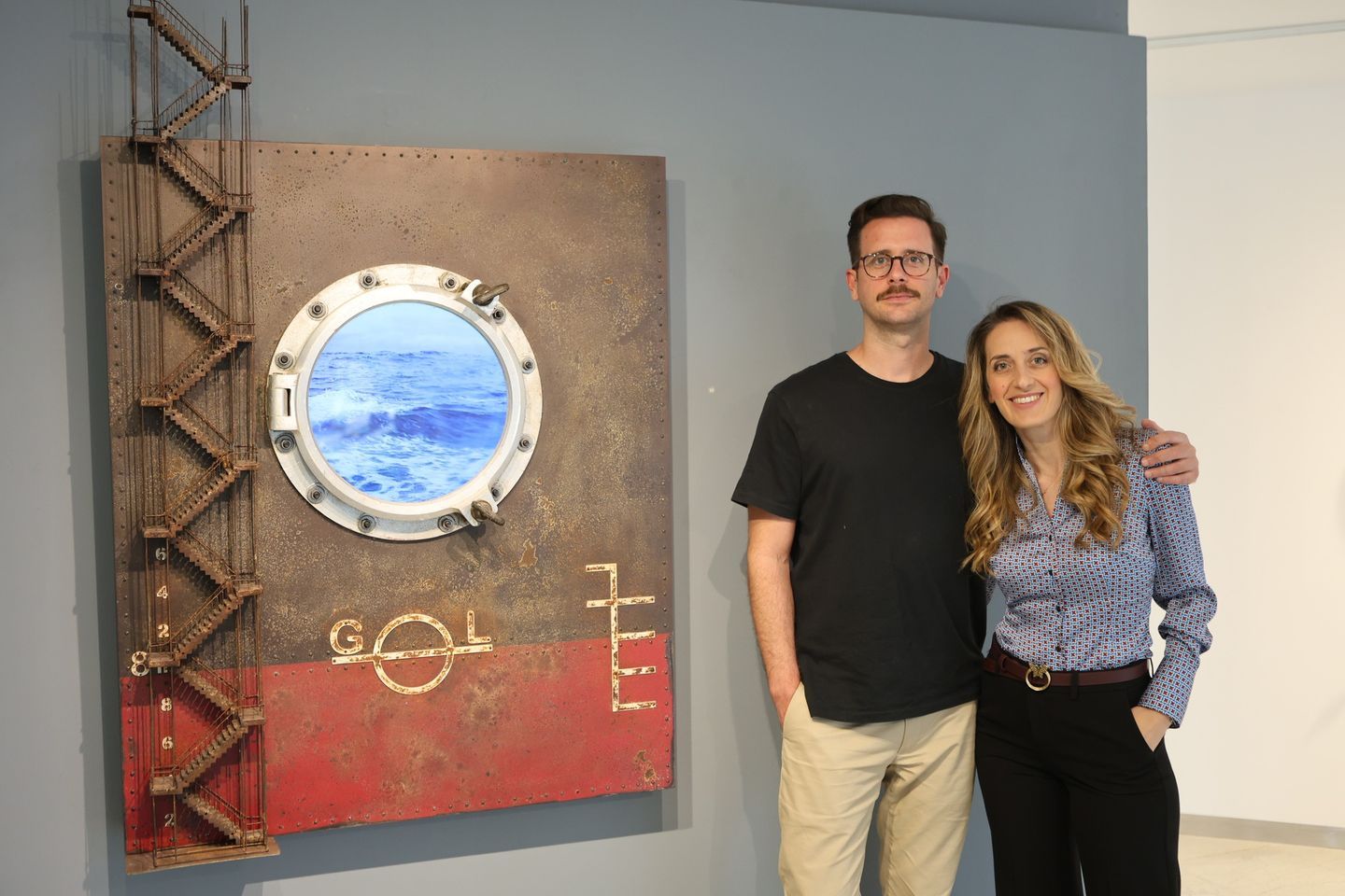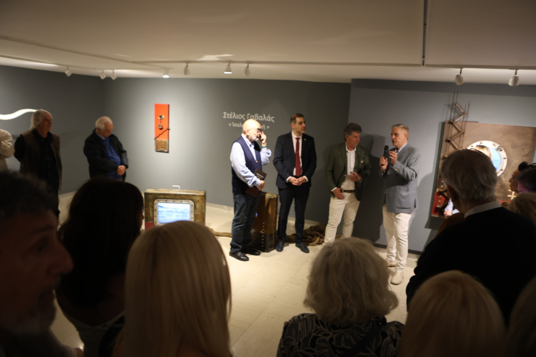 Ένας τέτοιος είναι και το εργαστήρι του Στέλιου Γαβαλά. Γεμάτο από εργαλεία εξακολουθεί να είναι ένας μικρόκοσμος από μόνο του, που αντανακλά την μέθοδο δημιουργίας του καλλιτέχνη. Ο επιμελητής της έκθεσης, Γιάννης Κολοκοτρώνης, γράφει για τα έργα μέσα σ’ αυτό το φαινομενικά χάος: «… Από το 2020 και μετά, ο Στέλιος Γαβαλάς έχει ξανοιχτεί σε μια διαφορετική εξερεύνηση από τις σειρές με τις ουτοπικές σκαλωσιές των νεοκλασικών σπιτιών της Αθήνας του ’30 που συναντούσαν τα σύννεφα, τις αιωρούμενες βάρκες και τις αιωρούμενες πολιτείες. Το καινούργιο project του είναι μια συνδυαστική προσπάθεια να υφάνει έναν ιστό εμπειριών που ξεπερνούν τα όρια του χρόνου και της τεχνολογίας και να παρασύρει το θεατή σ’ ένα ταξίδι ακουστικής αίσθησης, μνήμης και συναισθήματος που συνδέει τους ανθρώπους. Πέντε γυαλισμένα φουγάρα πλοίων χάνουν της λειτουργική τους ιδιότητα και γίνονται αγωγοί για μια συμφωνία ήχων. Εξοπλισμένα και αυτά όπως τα Μουσικά Φουγάρα του Αλίμου, με ενσωματωμένα ηχεία μέσα στους κυλινδρικούς κορμούς τους, με χορδές και μουσικά κλειδιά εξωτερικά, να αντηχούν τους ήχους της θάλασσας και του ανέμου, δυναμώνοντας την ακουστική εμπειρία του χώρου, μεταμορφώνουν το ρεαλιστικό τους πλαίσιο και αλλοιώνουν τη μνήμη που θα αντικατασταθεί από την σύγχρονη ακουστική αισθητική».