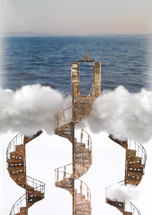 Η Ουτοπία είναι μια φιλοσοφική έννοια ανάμεσα στον Υλισμό και τον Ιδεαλισμό, ανάμεσα στην Ιστορία και τον Μύθο. Μεταξύ τους και χωρίς περιοσμούς, κινείται η ανθρώπινη επιθυμία. Αυτή, διαρρηγνύει τα όριά τους, έτσι ώστε το ανθρώπινο όν να επιβιώνει σ’έναν υλισμό με στόχους, να επιδιώκει υλοποιήσιμα ιδεώδη, να διδάσκεται από μια ιστορία με πρότυπα και να επινοεί μια μυθολογία του πολιτισμού βγαλμένη από τις συνήθειες των λαών. Οι απραγματοποίητες επιθυμίες παραμένουν στη σφαίρα της ουτοπίας, ενώ οι υλοποιήσιμες, κάτω από ειδικές συνθήκες και μέσω των κοινωνικών μηχανισμών, μεταπηδάνε στη σφαίρα στου πραγματικού. Βυθισμένος σ’ αυτές τις έννοιες, για περισσότερα από δέκα πέντε χρόνια, ο Στέλιος Γαβαλάς, επινόησε και διαρκώς το εμπλουτίζει, ένα οπτικό λεξιλόγιο ουτοπικής τέχνης για να εισβάλλει στα όνειρα και τις επιθυμίες των ανθρώπων. Θυμόμαστε την ουτοπική του προσπάθεια, στη σειρά “παράθιναλός” (2001. Έκφραση) να παγιδεύσει τη θάλασσα σε βαλίτσες, παλιά κασόνια, βάρκες και ταχυδρομικούς σάκους, σαν τον Ξέρξη που διέταξε τους στρατιώτες του να μαστιγώσουν τη θάλασσα του Ελλησπόντου. Θυμόμαστε στις “Αιωρούμενες Πολιτείες” (2007. Εικαστικός Κύκλος), τα πολύχρωμα μοντέλα πόλεων να ταλαντεύονται στο χώρο, σα μπαλόνια φουσκωμένα, πάνω από ψηλόλιγνες φιάλες αερίου. Στην καινούρια σειρά έργων με τον τίτλο “Ουτοπία” οι σκάλες είναι το μεταφορικό μέσον για την ταξιδιωτική μυθοπλασία, και το σύννεφο, ένας διαρκής μεταβαλλόμενος αχαρτογράφητος τόπος ονείρων. Ο Χριστιανισμός, ερμηνεύοντας μεταφορικά τη λύτρωση από την αμαρτία, εικονογράφησε την κλίμακα στο όνειρο του Ιακώβ, την Παναγία των Χαιρετισμών ως τη σκάλα για να κατέβει ο Θεός στους ανθρώπους («Χαίρε κλίμαξ επουράνιε, δι’ ής κατέβη ο Θεός”), και τις τριάντα βαθμίδες της κλίμακας του Ιωάννη του Σιναΐτου για να ανέβει ο άνθρωπος στον Θεό. Στο νέο ταξίδι του Γαβαλά δεν υπάρχει χριστιανικός εξαγνισμός, ούτε αριστοτέλεια κάθαρση. Ο καλλιτέχνης δεν είναι άγιος, ούτε ενεργεί ακολουθώντας άγραφους κανόνες ηθικής. Ως ενδιάμεσος, ανάμεσα στην πραγματικότητα και το όνειρο, δημιουργεί ποικίλες ανυσοϋψείς μεταλλικές κατασκευές, τις σταθερές κατακόρυφες σκάλες στο χώρο. Και πρόκειται για μια ψυχολογική προσέγγιση της ανθρώπινης επιθυμίας όταν επιλέγει τη σταθερότητα της κατασκευής αντί μιας σκαλιέρας, δηλαδή, μιας σχοινένιας αιωρούμενης ασταθούς σκάλας σαν αυτές που χρησιμοποιούνται στα πλοία. Ο θεατής πρέπει να εξοικειωθεί για να ξεπεράσει το ομοειδές ανεκδοτολογικό τους περιεχόμενο, για να αρχίζει να διακρίνει την ποικιλία των κατασκευών. Μονοί ανοδικοί έλικες, διπλοί έλικες που παραπέμπουν στη δομή του DNA, κάθετα ζικ ζακ, κυκλικές και αξονικές σκάλες, όλες είναι μεταλλικές κατασκευές, που χάνουν τη βαρύτητά τους όταν στην κορυφή συναντώνται με ανάλαφρα λευκά σύννεφα από βαμβάκι. Αυτό, το οπτικό παιχνίδι ανάμεσα στην σκληρή υφή του μετάλλου και τη μαλακιά του βαμβακιού, ανάμεσα σ’ ένα υλικό του βιομηχανικού κόσμου και ένα φυσικό υλικό, που κατά καιρούς απασχόλησε τους καλλιτέχνες στον 20ο αιώνα, συνθέτουν εξαιρετικής ποιότητας αντιθέσεις, εναλλαγές και εντάσεις. Όσοι αναγνωρίζουν στις σκάλες του Αχιλλέα Απέργη (1909-1986) ένα οδοιπορικό στη Γνώση, και βλέπουν σήμερα στις σκάλες του Στέλιου Γαβαλά ένα ταξίδι στην Ουτοπία, αντιλαμβάνονται την καταπληκτική δύναμη του συμβόλου πέρα από τη 