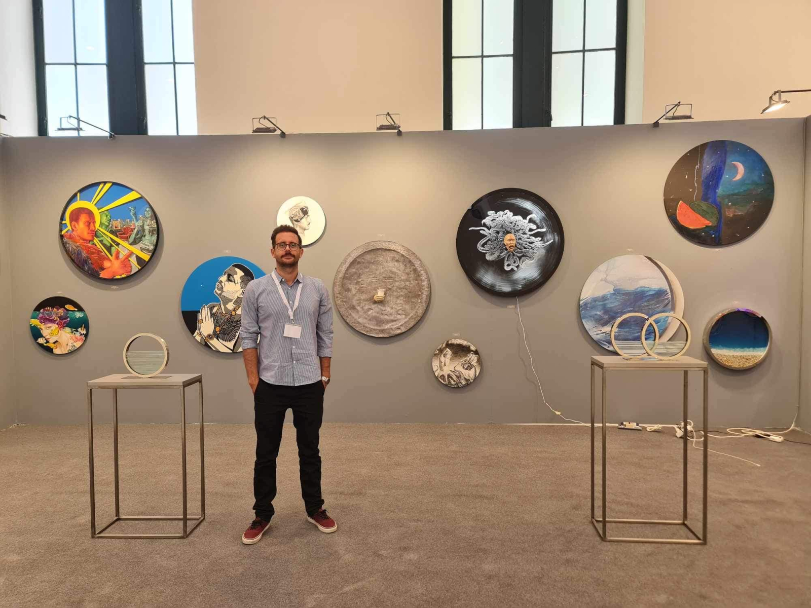 thy that in the circle’s shape and in the “cycloptic” canvas, all types of painting can fit: from the most realistic representation to the most lyrical abstraction, and from freehand writing to the precision of geometric shapes. From discipline to the most liberating gesture. In other words, everything! That’s why the way the works are displayed is intended to evoke the combinations of constellations in a nighttime sky in which the viewer also moves and travels!